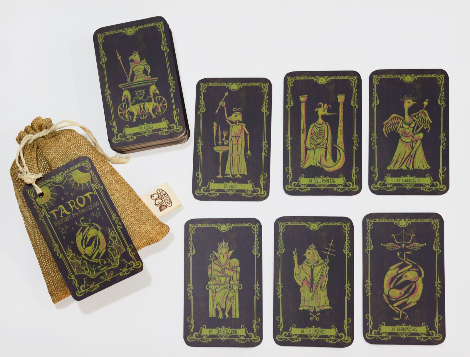 Esta baraja completa del tarot—con arcanos mayores y menores—está inspirada en el clásico Tarot de Marsella, pero reimaginada con una estética única: cada carta es una ilustración original protagonizada por personajes mitad humano, mitad ave. Las aves no están elegidas al azar: cada una encarna la energía de la carta que representa. El pavo real, majestuoso y radiante, da vida a la Emperatriz.