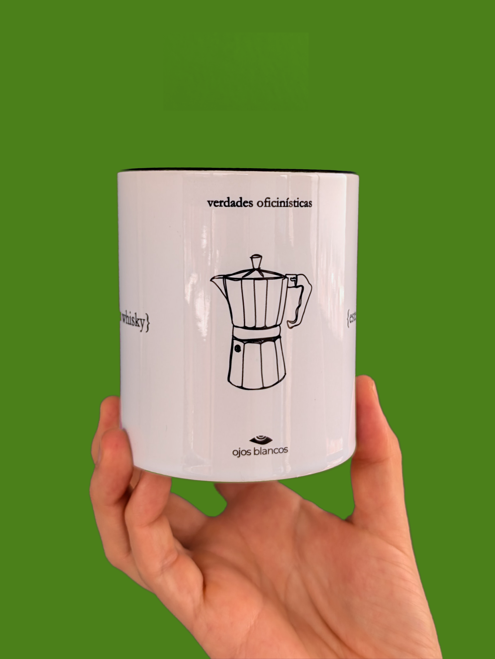 Taza de la serie “Verdades oficinísticas”. Color blanco con interior negro, texto negro y diseño en línea negra. Regalo sticker de colores.